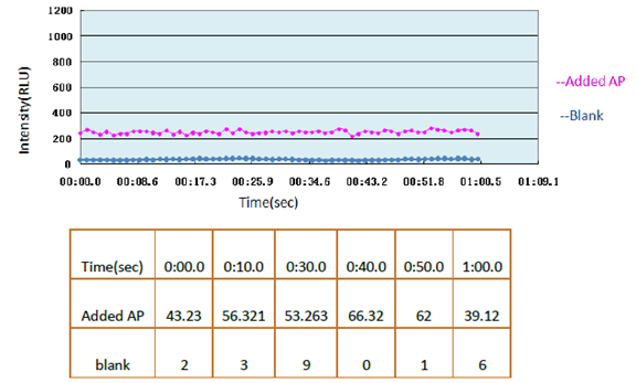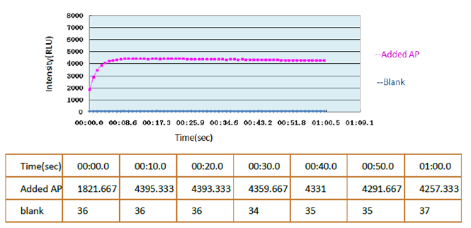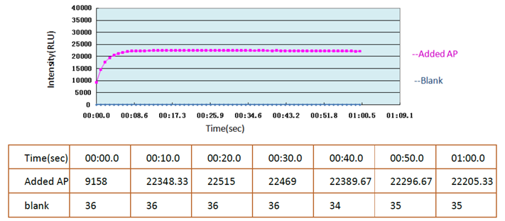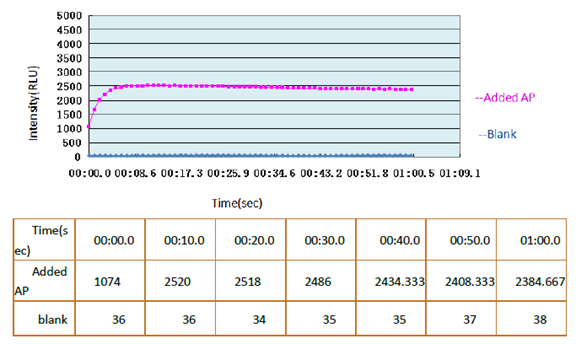 平台期短---8sec(提高了检测速度,同类产品15-30min)、灵敏度高---<10-19mol AP、AP数量和发光量有着良好的线性关系、对温度不敏感,室温至35℃均可测试